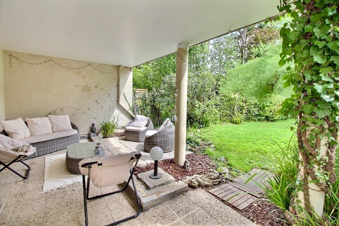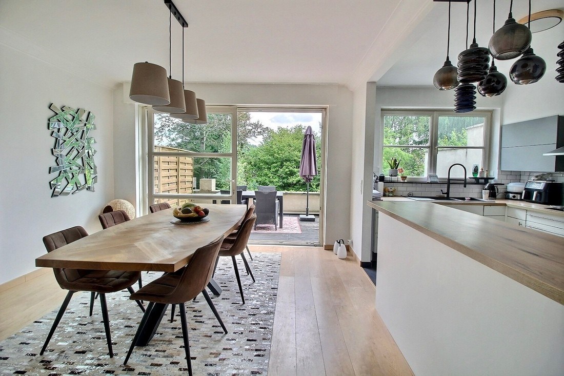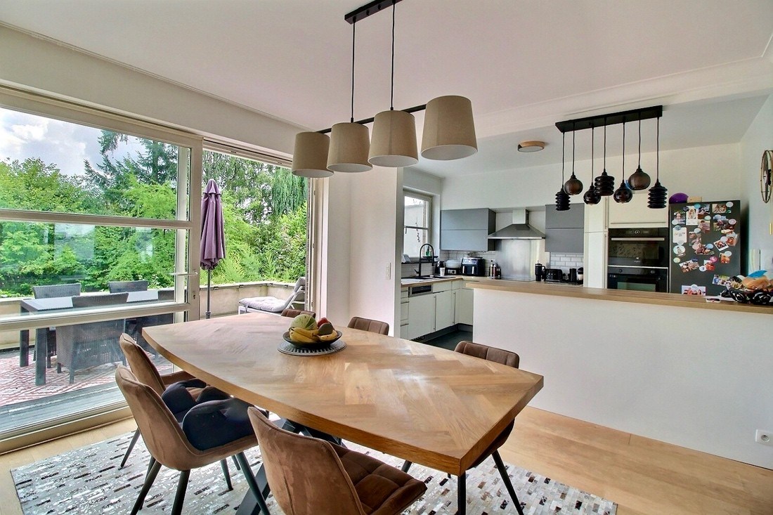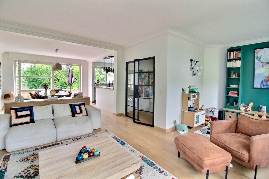 Premier étage : vaste séjour en L comprenant un salon et une salle à manger, le tout ouvert sur une cuisine américaine entièrement équipée. Cette pièce de vie lumineuse donne accès à une belle terrasse surplombant un écrin de verdure.